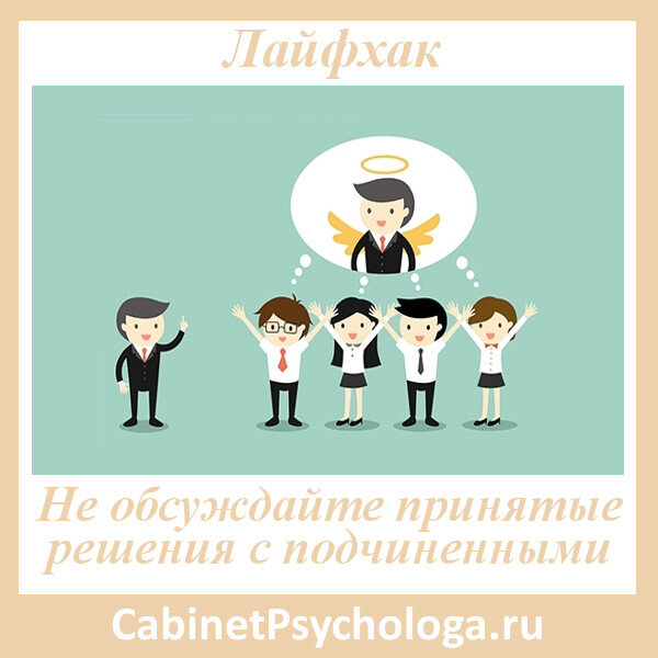 Мне лично кажется, что этот лайфхак применим в любой ситуации. Не обсуждайте принятое решение с подчинёнными (членами семьи, друзьями). Если вы сделали выбор, то вердикт должен быть окончательным. Сбор мнений уже пройденный этап. Не возвращайтесь к нему. Ваши сомнения могут помешать планомерному выполнению задуманного. Колебания в процессе выслушивания мнений всех желающих отнимают время и энергию от дела. Сопротивление новому будет всегда, ведь гораздо приятнее пообсуждать что-либо, чем работать над собой и творить. Не давайте людям вокруг время для сотрясения воздуха, есть задача, а значит она быть выполнена.