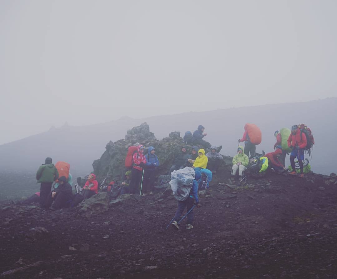 Проходим по снегу около вулкана Эйяфьядлайёкюдль, того самого, что остановил полеты в Европе пару лет назад и обильно поплевал свежей лавой вокруг. Народ налетает на лаву, набирает в карманы в качестве трофеев. Голова уговаривает не следовать примеру: и так тяжело, каждый грамм на счету. Идем по снегу. Татьяна падает на колени и набирает снег, начинает его есть, а он черный, покрыт лавой. Ей просто уж очень сильно захотелось пить, а вода закончилась. Идем. Знак в тумане: 1 км до привала! Тело теплеет, ноги идут быстрее!
