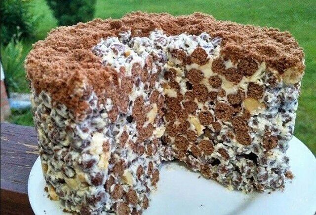 Ингредиенты: 250 гр сгущенного молока 180 гр сливочного масла 1 уп. шоколадных шариков (250 гр) (сухие завтраки) 100 гр жареного арахиса Приготовление: 1. Сливочное масло 85% жирности (это обязательно, масло меньшей жирности не подойдет) оставляем при комнатной температуре на некоторое время, чтобы оно стало мягким. 2. Кладем масло в миску и взбиваем миксером до однородности. 3. Начинаем добавлять порциями молоко, каждый раз все взбивая миксером. 4. У нас должен получиться густой крем: сгущенного молока может уйти и больше, и меньше — все зависит от его качества. Следите за тем, что консистенция крема не была жидкой. 5. В крем отправляем жареный орех (несоленый), перемешиваем. 6. В последнюю очередь отправляем в миску с кремом шоколадные шарики (из серии сухие завтраки). И очень тщательно перемешиваем. 7. На сервировочную тарелку ставим разъемное кольцо (диаметром 16-18 сантиметров), оборачиваем его разрезанным на полоски файликом (для бумаг) и смазываем растительным мас