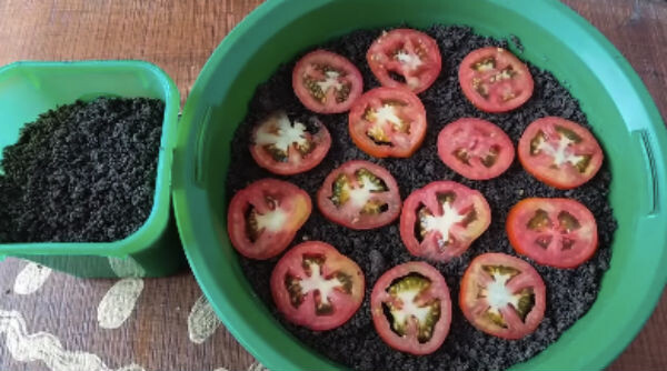 Просто гениальный и, пожалуй, самый легкий способ мне подсказала соседка, долгое время занимающаяся выращиванием и выведением самых разных сортов помидоров. Для начала берем спелый томат понравившегося сорта и режем его на колечки. Далее насыпаем в тазик или контейнер немного грунта (здесь не принципиально, можно выбрать любую подходящую емкость). Раскладываем колечки по всей площади емкости и засыпаем их грунтом. Нужно сделать так, чтобы они полностью были скрыты. Далее, обильно поливаем и оставляем в покое... Примерно через 2 недели видим такую картину: