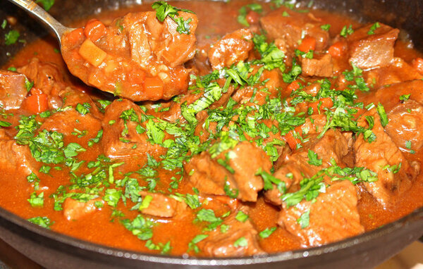 На 6 порций потребуется: 900 грамм мякоти шейки, предварительно нарезанной на кубики со стороной 4 см; мука для панировки; 45 мл. (3 столовые ложки) растительного масла; одна нарезанная большая луковица; одна тонко нарезанная морковка; два тонко нарезанных стебля сельдерея; 10 мл. (2 чайные ложки) сахарного песка; 5 мл. (1 чайная ложка) порошка английской горчицы; 15 мл. (1 столовая ложка) томатного пюре; полоска апельсиновой цедры размером 2,5 на 7,5 см; пучок ароматных трав; 600 мл. пива "Гиннесс"; соль и молотый черный перец. Обваляйте говядину в муке. Разогрейте 30 мл. (2 столовые ложки) растительного масла в большой, неглубокой кастрюле, слегка подрумяньте в ней говядину порциями. Переложите в миску. Добавьте в кастрюлю остатки масла, обжарьте лук до золотистого цвета, высыпьте тонко нарезанную морковь и сельдерей. Добавьте сахар, горчицу, томатное пюре, апельсиновую цедру, пиво и приправы, затем пучок ароматных трав. Доведите смесь до кипения. Верните в кастрюлю мясо и весь сок