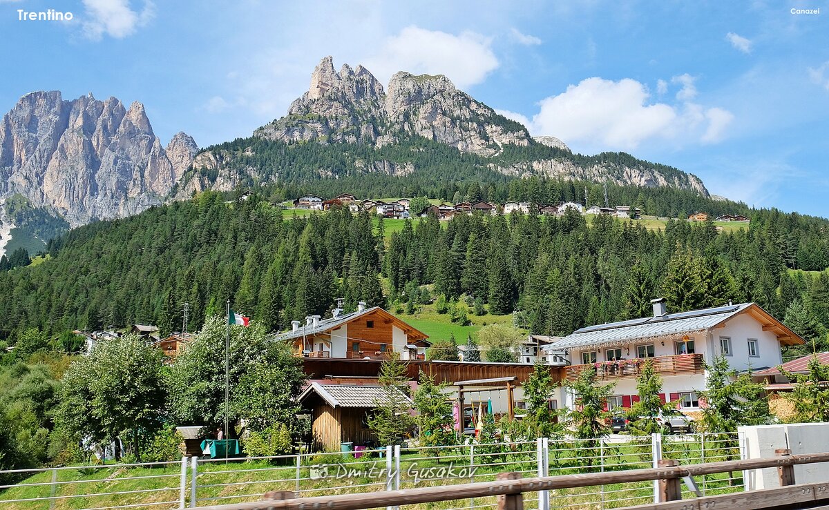 Остановился я в деревушке или коммуне Канацеи (Canazei), долина Валь-ди-Фасса. Приставка «валь» означает «долина». Второе потрясение после природных пейзажей - здания гостиниц, домов и санаториев. Все ухожены, красивы, фасады и балконы украшены цветами, неповторимо расписаны и такие симпатичные, что хочется сфотографировать каждый домик.
