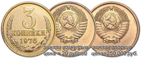 Эта монета не только чрезвычайно интересная, но и знаковая. Дело в том, что если тиражный вариант 3 коп 1976 г. стоит весьма не много, то одна из редко встречаемых разновидностей попадает в число самых дорогих монет СССР за весь период их выпуска. Порой можно видеть то, что в разных нумизматических каталогах есть противоречия, так как у авторов бывает разное мнение по поводу некоторых монет. Но вот в оценке этого редкого варианта все единогласно сходятся на цифре 250.000 рублей, признавая его бесспорную уникальность. Практически все монеты текущего года выполнены штемпелем 2.20. Зерна внутренних колосьев у них без остей и с заметно выгнутым лентам в гербе. Их стоимость не превышает 20 рублей. А вот подобная монета (зерна обязательно без остей) с плоскими лентами является уникальной, и к тому же