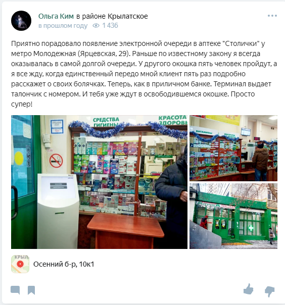 Не секрет, что в «магазинах лекарств» - аптеках, как и в других, время от времени возникают очереди. Образуются они по разным причинам, безусловно присутствуют колебания сезонного спроса (простуды, аллергии). Решением этого вопроса в аптеках «Столички» стало внедрение систем электронной очереди МАКСИМА. Предварительный заказ на сайте С февраля 2002 года на территории РФ введен запрет на дистанционную продажу лекарственных средств, их покупка с доставкой на дом через интернет-аптеки стала невозможной. Поэтому проблема очередей обострилась и здесь как нельзя кстати пришлась идея объединения функционала систем бронирования лекарств и электронной очереди. Для крупных аптечных сетей не составило труда изменить форму заказа на сайте, и теперь вместо оформления доставки покупателю предлагается оформить бронирование необходимых товаров в ближайшей аптеке. Выдача и оплата заказа После получения СМС о принятом заказе покупатель может забрать его в выбранном месте уже через час. Придя в апте