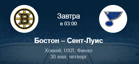 В данном финале будут бороться две из самых сильнейших команд,которые прошли групповые этапы Западной и Восточной конференции(Бостон и Сент-Луиз). Вчера ночью уже прошел первый матч между командами. В этой встрече победу со счетом 4:2 одержал Бостон. Сегодня ночью пройдет второй матч между командами Первая игра финала Кубка Стэнли закончилась для «Сент-Луиса» неудачно: «Блюз» вели в счёте в начале второго периода - 2:0, после чего пропустили четыре шайбы подряд, проиграли матч 2:4, и установили антирекорд Кубка Стэнли по количеству неудачных матчей финале. Для «Сент-Луиса» это четвёртый финал в истории, и пока команде не удалось выиграть ни одного матча. В ночь на 30-е мая в 3:00 по Москве состоится вторая игра, в которой «Блюз» постараются прервать эту серию. За время этого плей-офф «Бостон» однажды уже был в ситуации, когда команда вела в серии 2:0, это было в финале конференции против «Каролины». «Блюз» пока ещё ни разу не уступали 0:2 по итогам первых двух матчей, на счету «Сент-
