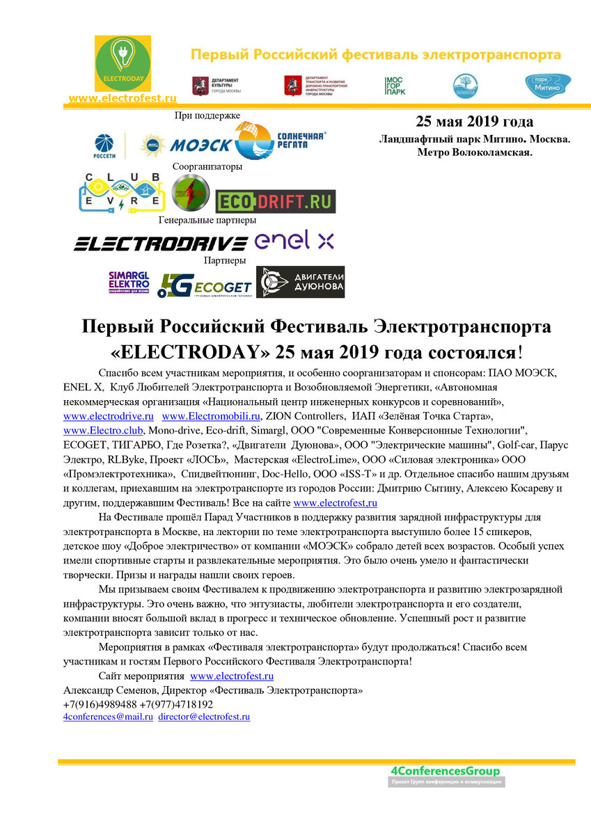 Первый Российский Фестиваль Электротранспорта «ELECTRODAY» 25 мая 2019 года состоялся!