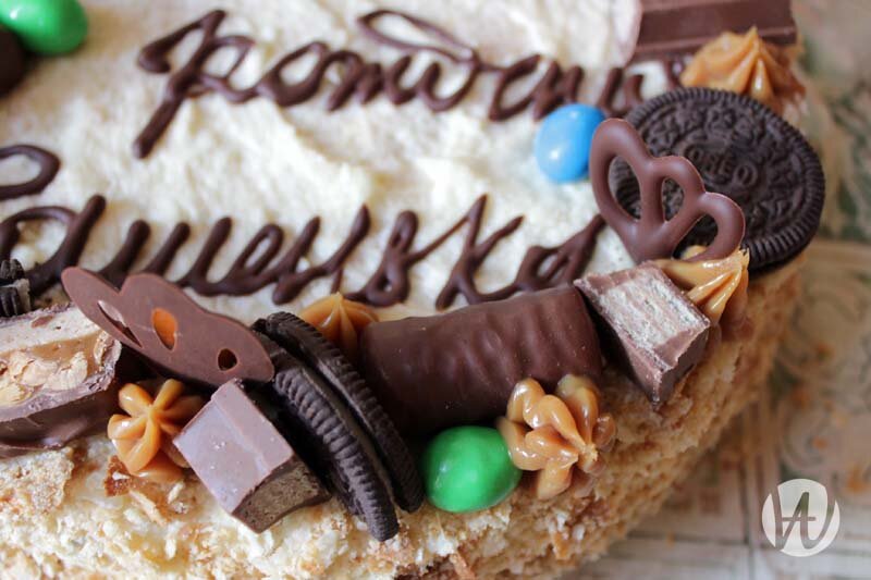 Помимо вкусного десерта торт также может являться подарком ко дню рождения. Да и вообще, украшенный торт к какому-либо событию только добавит ему изюминку. В данной статье представлен вариант украшения торта «Наполеон» ко дню рождения. О том, [как приготовить классический «Наполеон»] читайте тут. Что понадобится? Существует множество вариантов украшения тортов, мы используем упрощенный вариант украшения, а это значит, что элементы декора будут покупными. Как правило, во многих кондитерский для украшения используются готовые шоколадки, главное, подобрать ее размер. Итак, выбор пал на следующее: Как украсить? Шаг №1. Одним из правил создания шедевра является правильная композиция. Необходимо определить, будет ли надпись на торте или же вы добавите топпер, какое количество разновидностей сладостей вы хотите использовать. Главное, не переусердствовать. В данном случае, выбрана надпись. Растопите шоколад на водяной бане и напишите на торте пожелания, оставив по краям место для конфет. Шаг