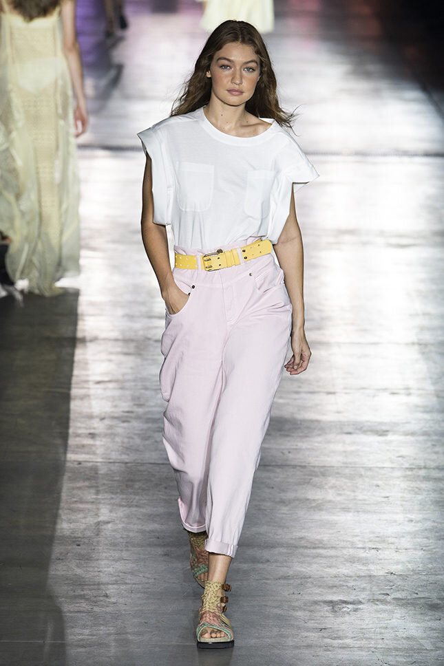 Розовый деним. Очередной повседневный образ, на этот раз от Джиджи Хадид. Бледные розовые джинсы, белая футболка с большим вырезом на рукавах, плетеная обувь в тон с кожаным ремнем, все это от Alberta Ferretti - итальянского бренда люксового сегмента. Образ от ALBERTA FERRETTI стоимостью в 91800 рублей. Платья, похожие на пушистые обертки, легкие длинные брюки, сумки, самые нежные оттенки розового — тренды сезона весна-лето.Если вы хотите добавить в свой образ нотки свежести и невинности, одевайте розовый. So lets see new outfit! 4100 рублей 2000 рублей 2800 рублей 300 рублей Итак, такой образ вышел нам в 9200 рублей. Образ можно разбавить сумкой мятного, лимонного или пастельно-розового цвета. NOTES Плетеная "бабушкина" обувь - ТОП в этом сезоне, берите и не думайте.Чем больше плетений на обуви, тем лучше. Данная модель сейчас со скидкой 40% (цена указана со скидкой) Базовых вещей не бывает много. Если покупаете белую футболку, возьмите еще черную, ей тоже найдется применение.