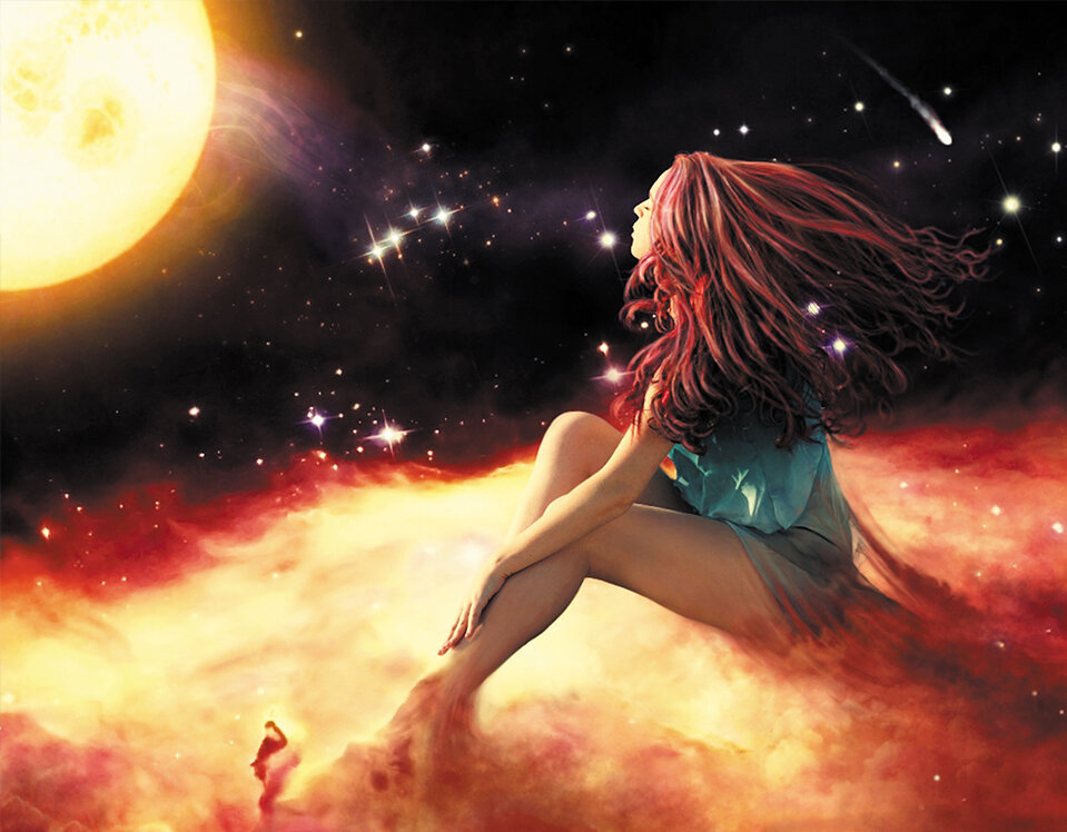 "Я поднимаюсь выше и начинаю растворяться в свете, постепенно наполняюсь энергией, восстанавливаюсь, с каждым вдохом у меня становится больше сил. Мне непривычно ощущать в себе столько энергии, но она мне нужна, чтобы пойти и снова ее растратить. Я чувствую себя огромным шариком, наполненным энергией... Вижу огромную гору и женщину в белых одеяниях. В пещере находится школа, куда меня направляет эта женщина. Захожу, сажусь за парту. Здесь много других людей, точнее они только с одной стороны люди, а с другой - святящиеся шарики. Учитель одет, как звездочет, он объясняет нам что-то, связанное со звездами и энергией. Каждый из нас рисует свою фигуру, со своими лучами энергии. Я осознаю, что уже много раз бывала здесь и рисовала свою фигуру. Только недавно вернулась сюда - моя память еще окончательно не восстановилась. В этом классе находятся все, кто только недавно вернулся и пытается все вспомнить".