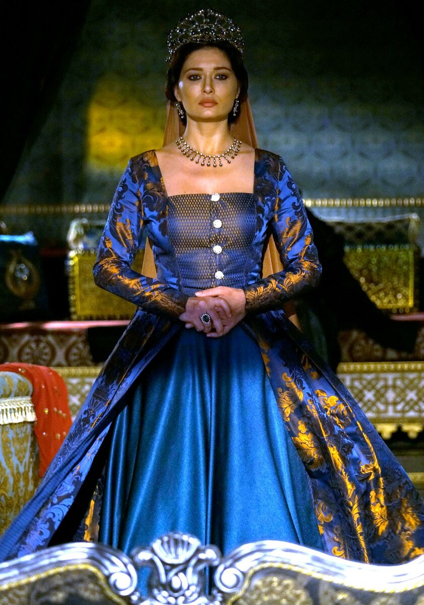 Я уже писала о некоторых платьях Кёсем Султан, ведь большинство нарядов этой султанши меня просто потрясло, насколько они были прекрасны. Сейчас я хочу продолжить данное направление и рассказать Вам еще о двух платьях султанши, мимо которых я не смогла пройти. Платье-хамелеон Кёсем Султан Наверное самое необычное и удивительное платье султанши, которое сразу же привлекло меня своим переливающимся оттенком. Под определенным углом оно синее, под другим - фиолетовое, а моментами оно вообще переливается золотым. На султанше такое платье смотрелось довольно величественно. Больше такого типа платьев у нее я не замечала. При этом, платье ничуть не откровенное, скорее наоборот, достаточно сдержанное. В данном образе также есть корона и ожерелье, однако, они довольно простые, наверняка, чтобы не отвлекать внимание от такого наряда. Красное платье с кружевами Я сразу же заметила, что на взрослой Кёсем Султан хорошо смотрится красный оттенок. Хочется отметить, что он ничуть не яркий, а скорее нао