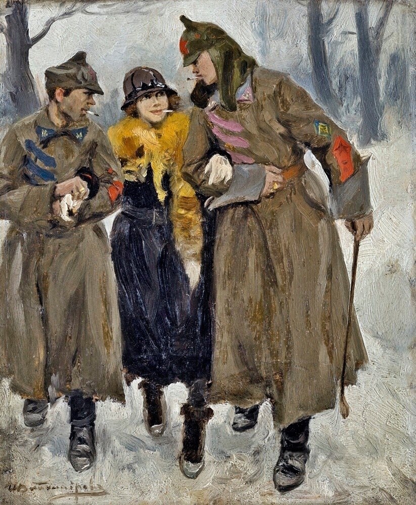 БОЛЬШЕВИКИ И ПРОСТИТУЦИЯ. Около 40 % проституток начала 1920-х были из дворянских или некогда зажиточных семей. Американский историк Фрэнк Голдер был потрясен печальным положением молодых женщин из старой московской элиты. По свидетельству еще одного американца, знакомого Голдера, в те годы «можно было заполучить любую женщину за плотный обед». (с) Дуглас Смит "Бывшие люди" Владимиров Иван Алексеевич (1869-1947) картина «Красноармейцы с проституткой» 1920-е.