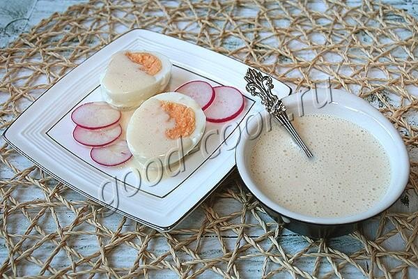 2 ч ложки лимонного сока или яблочного/винного уксуса (10г) Заранее отварить и остудить яйца. Очистить и вынуть желтки. В миску положить желтки и горчицу, насыпать соль и перец, налить воду и уксус. Если горчица острая, достаточно 0,5 чайной