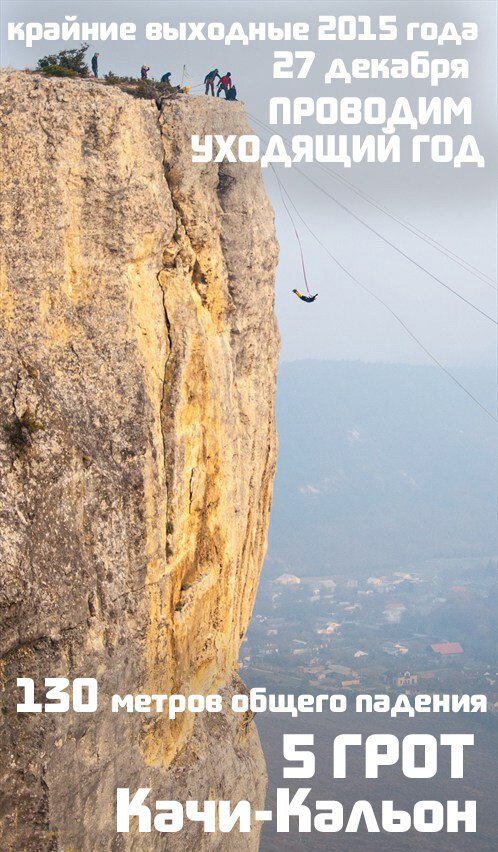 Однажды в соцсетях я увидел объявление о прыжках со скалы Качи-Кальон высотой 140 метров. Это западный Крым – район Бахчисарая. Дело было прямо под Новый Год и прыжки запланированы на 27 декабря. Ничего подобного я никогда не делал и мне очень захотелось попробовать и узнать какие это будут ощущения! Тем более на носу был праздник и так хотелось сделать себе особенный подарок. Итак я запланировал, что обязательно поеду. Проснулся 28-го числа рано утром и первая мысль была «да ну его нафиг». Переться несколько часов чёрт знает куда, да ещё подниматься на скалу. Было очень холодно и погода стояла дождливая, но всё же я заставил себя выплюнуться из дома и ни капельки не пожалел. Сам путь до скалы Качи-Кальон достаточно живописный по Южнобережному шоссе через Севастополь и занял примерно 3 часа. Проблемы с поиском места не возникло, так как в анонсе мероприятия был изложен подробный маршрут. Ввысь к уступу скалы тянется длинная тропинка через монастырь и нужно немного попотеть, чтобы ту