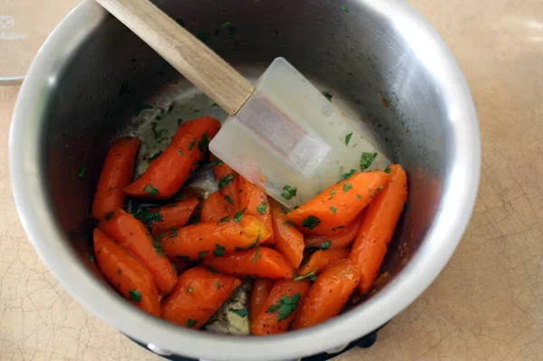 3. После этого оставить морковь на огне еще на несколько минут для карамелизации, она должна покрыться легкой корочкой-глазурью из сливочного масла и сахара.