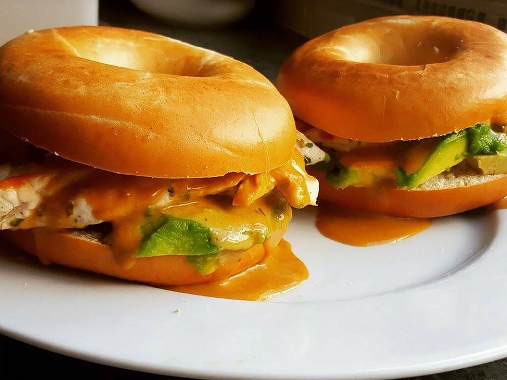 Бейгл или бейгель — выпечка, изначально характерная для еврейской кухни, ныне распространенная во многих странах. Приглашаем Вас в гастрономическое путешествие. Приготовим бейгл из курицы и авокадо со сливочным мисо соусом? Удивимся новым вкусовым качествам? Порций: 2 Ингредиенты: розмарин - 2, куриная грудка - 300г, авокадо - 1, мисо паста - 1 столовая ложка, сливочное масло - 1/2 чайной ложки, молоко - 50мл, эстрагон - 1/4 чайной ложки, мирин - 2 столовых ложки, кукурузный крахмал - 1/2 чайной ложки, соль. Подготовка - 20 мин; Калорий - 703; Белки - 52г; Жиры - 24г; Углеводы - 68г. 1. Для приготовления соуса, разогрейте сковороду и растопите сливочное масло. Обжарьте мисо пасту, чтобы она равномерно перемешалась с маслом. Влейте молоко и варите на среднем огне, затем убавьте огонь до минимума. 2. Нарежьте курицу. Нагрейте сковороду на сильном огне, обжарьте мясо. Приправьте эстрагоном, солью и мирином. 3. Нарежьте авокадо. Бейглы разрежьте пополам и поджарьте. 4. Чтобы соус мисо заг