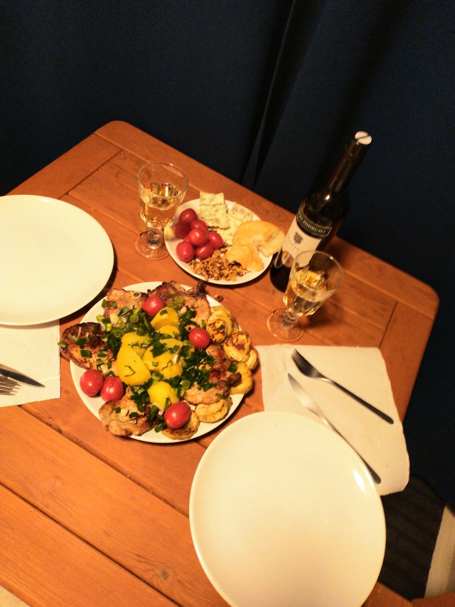 Летний отдых в апартаментах даёт возможность готовить самим, при этом хочется ужинать красиво и вкусно, но по - возможности быстро и не дорого. На приготовление этого ужина у меня ушло 15 - 20 минут вместе с сервировкой. Продукты на 2 человека: телятина вырезка 700 гр, баклажаны 2 шт, картофель 8-10 шт, в зависимости от размера, зелень, помидоры черри. Вкусно! Мясо получается очень нежное, баклажаны дают вкус грибочков, а картошечка с лучком, особенно молодая божественно хороша. Ужин прекрасно дополнит красное вино, у нас оно к сожалению на тот момент закончилось, а вот вы берите с запасом, а к нему очень неплохо сыр, оливки и грецкий орех и пусть вам будет вкусно!