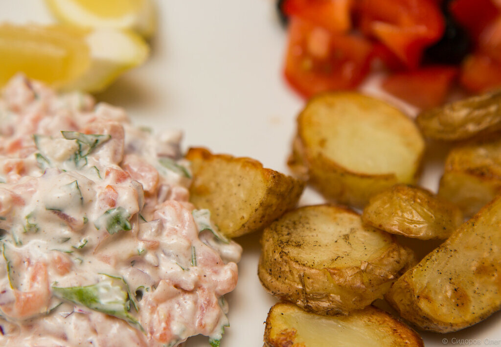 Картофель с кремом из форели и овощами: полноценный ужин из трех блюд за полчаса