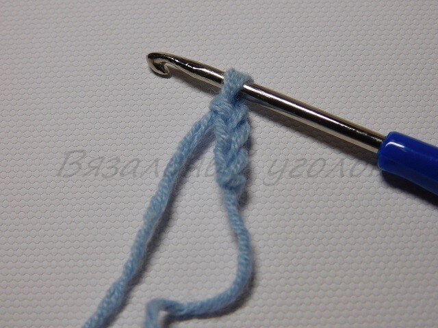 Теперь вводим крючок в первую воздушную петлю и так же протягиваем через нее нить. На крючке в итоге получилось три петли.