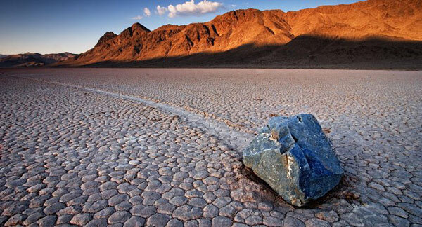 Американский национальный парк, известный под названием Долина смерти, привлекает туристов своей магической загадочностью. Расположенный в штате Калифорния, он занимает территорию около 13,5 км2, на которой находится высохшее древнее озеро Рейстрак-Плайя. Но основной достопримечательностью являются валуны разного размера, которые удивительным образом перемещаются по суглинистому дну, состоящему из окаменевшего ила, застывшего в виде сетки из неправильной формы шестиугольников. Знаменитые движущиеся камни из черного доломита имеют вес до нескольких сотен килограмм, оставляя после себя следы глубиной 2-3 см. Их передвижение происходит без вмешательства человека или животных. Причем маршруты булыжников разные: одни двигаются по прямой, другие оставляют витиеватые узоры, а некоторые годами остаются на месте. Такое «поведение» камней долгое время остается загадкой для ученых. Во времена золотой лихорадки старатели ходили через эту долину на прииски. Золотоискателям приходилось идти чере