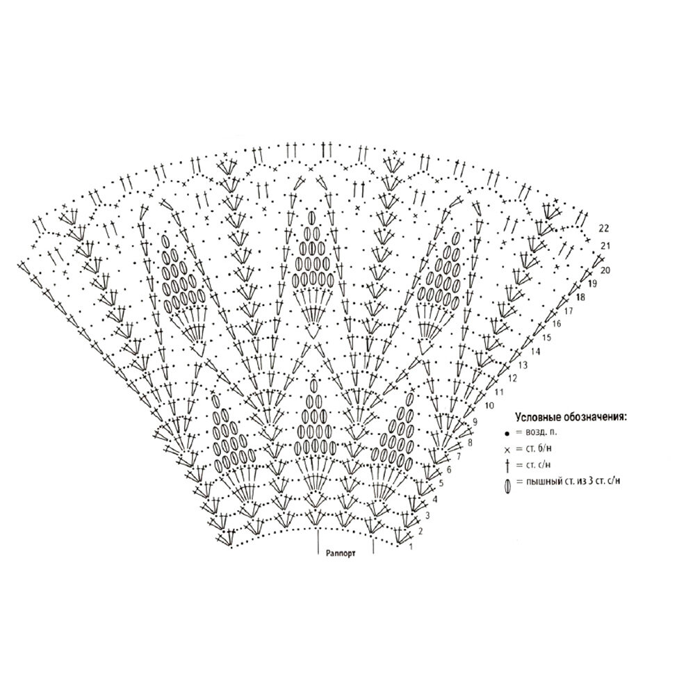 Выбираем любую схему для вязания крючком - в интернете огромное количество узоров на любой вкус. В поиске задаем "узор крючком с расширением" - и выбираем для удобства расчета узор с небольшим рапортом. Как правило такие узоры дают постепенное, плавное расклешение. Если за основу взять рисунок вязанной салфетки, то расклешение будет очень сильное. Для такого узора лучше взять тонкую пряжу, чтобы не получить слишком большой объём.