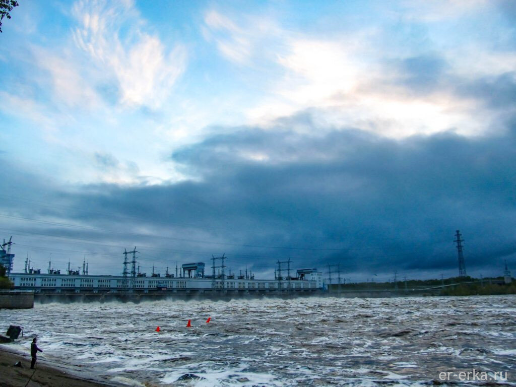 Как обычно, адекватные люди в 4 утра в воскресение спят, но я то не такой, и в 4 утра выдвинулись на КамГЭС — встретить рассвет при сбросе паводковых вод. Если кратко, КамГЭС набирает воду во время паводка, а после — сбрасывает ее, обычно это происходит в конце майских праздников, но в этот раз, погода была странной — вначале было очень холодно, много снега, потом вдруг наступила жара в 30 градусов. Наверное, все это стало причиной, что спуск воды начался так поздно. Плотина — 1800 метров длиной, высота максимальная 35 метров, 522 мегаватта энергии, строить начали 70 лет назад, длина водохранилища аж 300 км, максимум ширины — 18 км (как то я там на середине попал в шторм, добавивший столько эмоций…). Вообще, ГЭС должны были построить еще и в Соликамске, и тогда бы появилось общее водохранилеще для рек Кама, Вычегда и Печора — самый эпичный и огромный проект. Тогда были бы соединены Северный ледовитый океан и Каспийское море! Но этого, в итоге, не случилось. Но и, стоя недалеко, чув