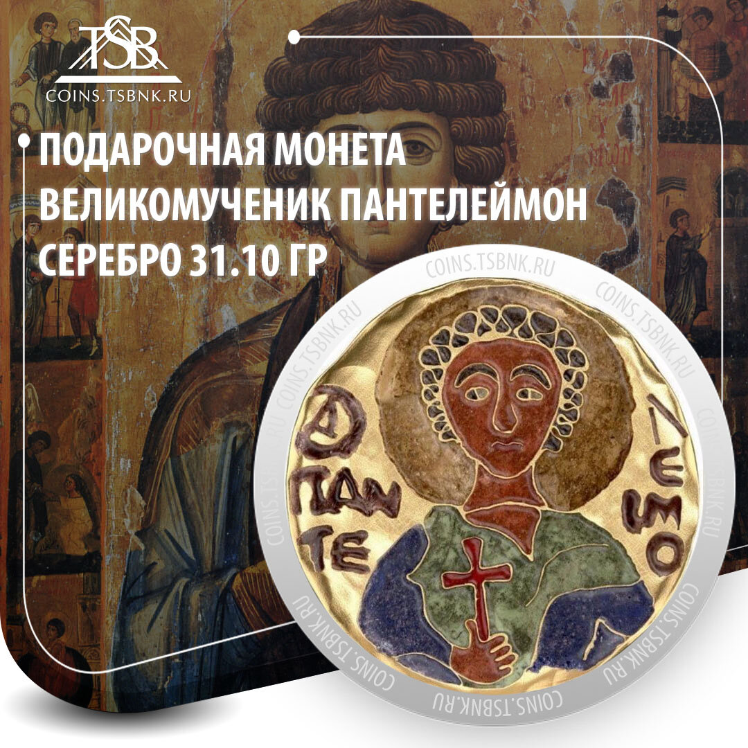 В активе трансстройбанк есть подарочная серебряная монета Великомученик Пантелеймон. Монета интересна своим внешним видом и отображает На реверсе Святого православного Великомученика Пантелеймона. Образ Святого изображён в стилистике древней христианской фрески сложенной из мозаики. А по обе стороны от образа разместили надписи с именем Пантелеймона на греческом языке. Пантелеймон с греческого языка означает всемилостивый. До того как стать крещеным великомученик носил имя Пантолеон. Согласно истории Святой родился в семье знатного язычника В древнем городе Никомедии, что располагалось на подступах к Константинополю. В отрочестве отец отдал сына учиться врачеванию. О достижениях молодого врача услышал римский император Максимиан и потребовал служить Панталеону при дворе. Согласно описание с христианством будущего Святого познакомил пресвитер Ермолай. Вдохновленный рассказами о религии однажды Панталеон увидел как от укуса ядовитой змеи умирает ребёнок. В молитве тот обратился к Хрис