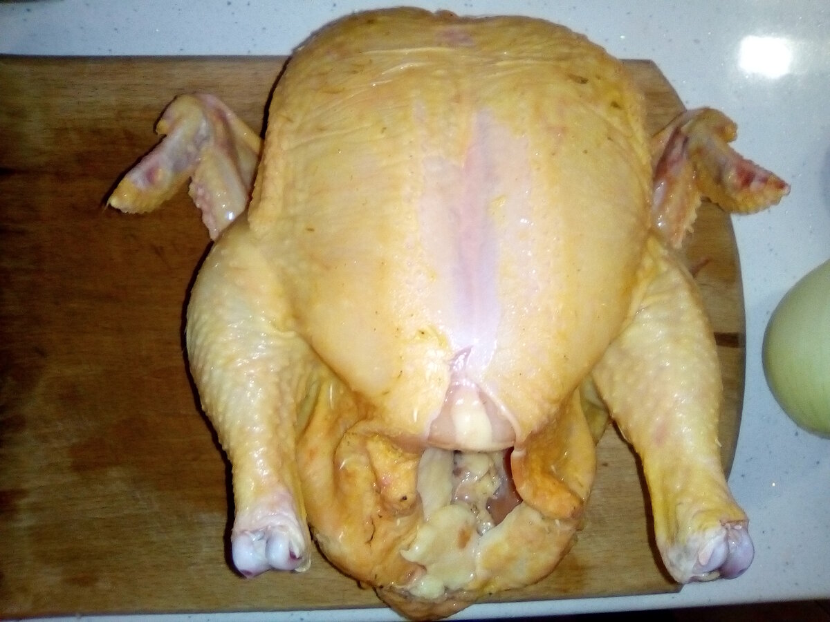 Недавно я купил домашнюю курицу по акции – всего 149 рублей за кг. Купил увесистую тушку – почти на 2 кг. Вот она: Впрочем, если подходить строго, курица эта не совсем домашняя. Мне ли этого не знать? Я сам подом из сельской местности, приходилось и мне выращивать бройлеров, так что представляю, как выглядит и даже пахнет свежая домашняя курица. Тушка, которую я купил, называлась «Курица фермерская», и похоже, она действительно не с птицефабрики – более мясистая и цветом желтоватая. Забегая вперёд, скажу, что к качеству курицы претензий у меня не возникло, и курица своих денег, безусловно, стоит. Я решил не мудрствовать и приготовить тушёную с овощами курицу. Кстати, вот здесь я писал, как готовлю тушёную свинину. Рецепты похожи, но в случае с курицей я решил использовать мультиварку. Если мультиварки нет, можно обойтись и кастрюлькой. Продукты: Курица домашняя – 1 целая тушка Луковицы – 3 шт. Морковь – 2 шт. Очищенная вода – 1 л Соль, перец. Лук и морковь быстро нарубаю ножом. Курицу