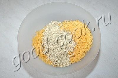 Нужно учесть, что после запекания вкус лепёшечек будет значительно менее ярким, чем первоначальный вкус сыра. Поэтому, если хотите получить очень яркий вкус, нужно добавить что-нибудь острое - чеснок или аджику. К тому же сырную массу можно немножко подсолить. СОСТАВ 150г сыра, 50~60г кунжута, при возможности - фисташки, при желании - аджика, чеснок, соль Сыр натереть на средней тёрке.