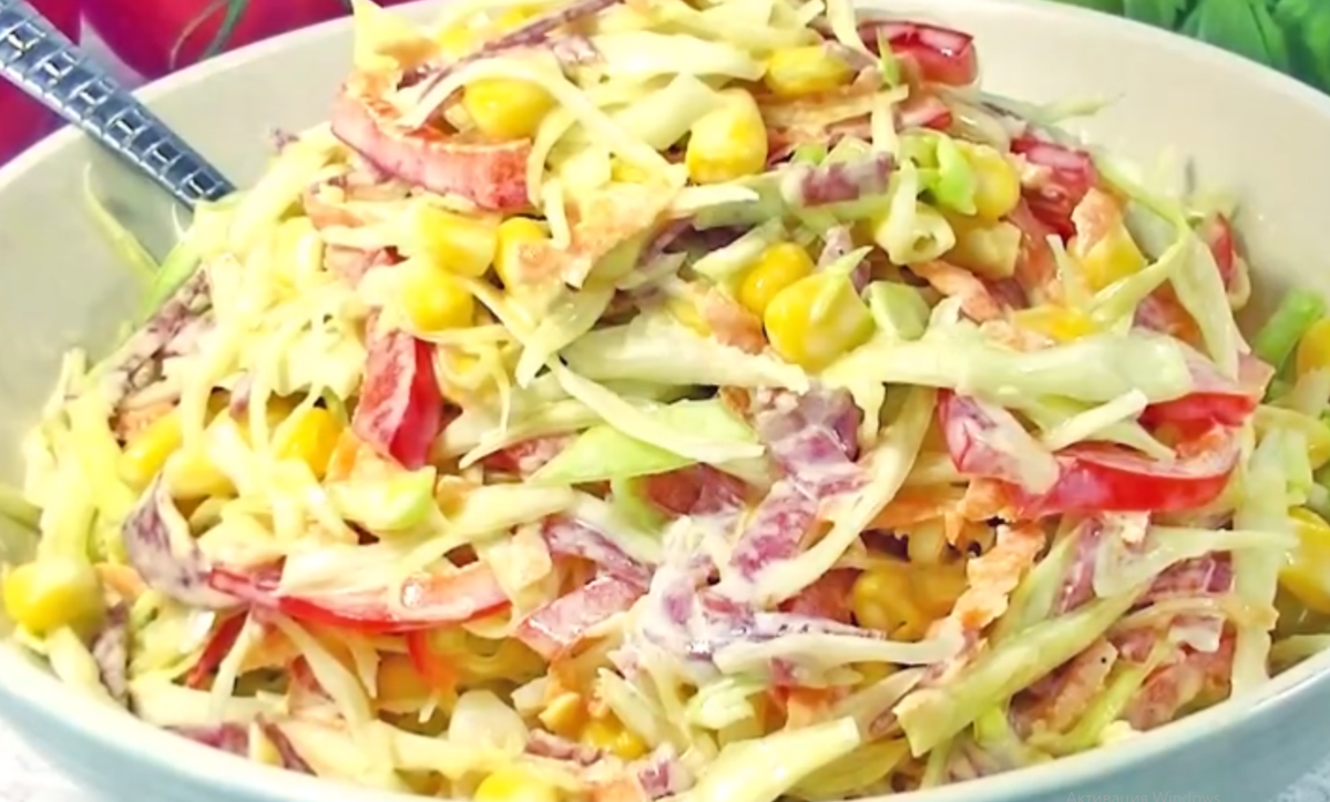 Дорогие мои подписчики, сегодня хочу предложить вам рецепт очень простого, но невероятно вкусного салата. Готовится за пять минут, состав проще не придумать! Не забывайте, пожалуйста ставить пальчик вверх, делиться нами в социальных сетях и подписываться на канал! Ингредиенты 300 гр. молодой капусты (можно заменить на пекинскую или красную) 1 сладкий красный перец 200гр. моркови 150-200 гр. салями или сервелата 150 гр. консервированной кукурузы Заправка 500 гр. сметаны 50 гр. майонеза Соль и черный молотый перец по вкусу 2-3 зубчика чеснока 2 столовые ложки лимонного сока Приготовление Капусту мелко нашинкуем, обязательно помнем руками, чтобы выделился сок, затем добавим тоненько нерезаный перец, морковь, натертую на крупной терке, кукурузу, колбасу, нарезанную тонкой соломкой. Готовим заправку: смешаем выжатый через пресс чеснок, сметану и майонез, добавим соль и любимые специи, польем лимонным соком, по желанию добавим рубленую зелень, иди зеленый лук, перемешаем. Заправим салат,