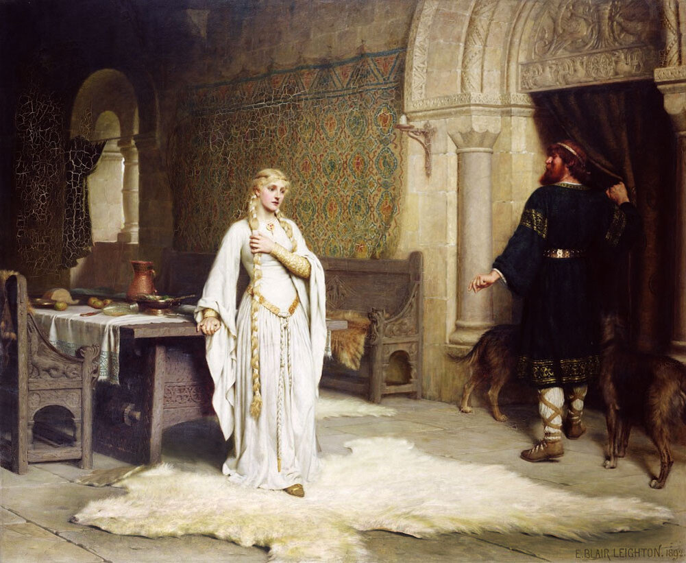 Прекрасная Годива печальна, лицо сосредоточено. Она уже обдумывает, как ей выполнить задание. Раздеться женщине в ту эпоху было грехом. Тем более так