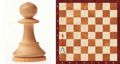 Пешка совершает только один шаг на плоскости доски вперед (первый раз может два), а съедает фигурку противника по диагонали. Превращается в любую фигуру, если ей удастся дойти до противоположного края доски.