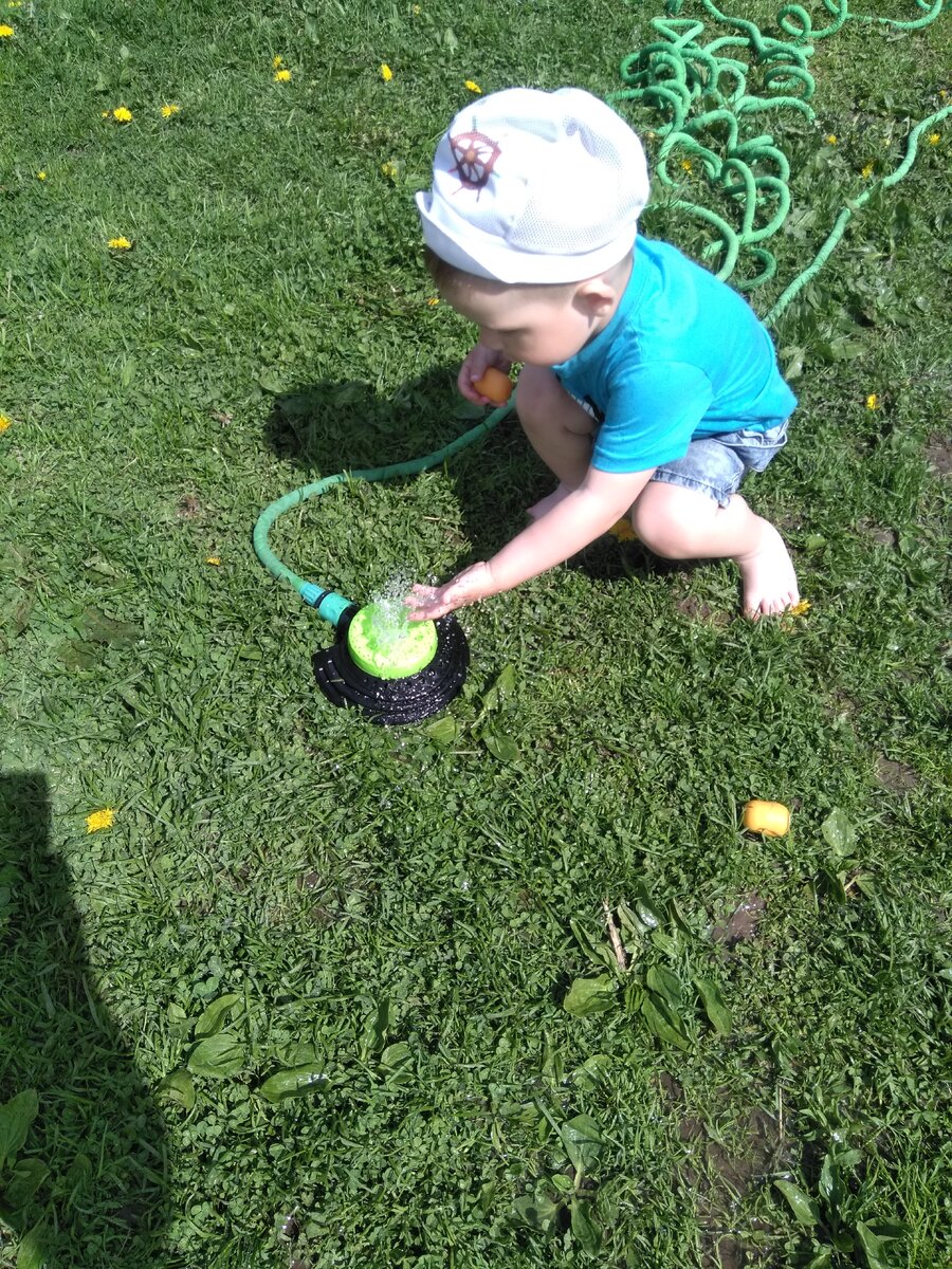 Всем привет! Вот и наступили тепленькие деньки. Мы с сыночком так их ждали. Можно бегать босиком по траве, играть с водой. Кому интересно... такое приспособление на шланг купили вчера в гипермаркете за 200 руб. Ребенок счастлив. От солнышка можно прятаться в домике... Я очень рада что можно целый день гулять на улице, с перерывами на перекусы и дневной сон. Не надо дышать городской пылью, слушать шум машин. А когда хочется разнообразия... можно и на городскую площадку сходить. В километре от нас строится новый жилой комплекс и детская площадка уже стоит. Туда и ходим. Я вижу только плюсы от жизни в частном секторе, на своей земле. Кстати мы уже посадили огурцы, помидоры, зелень. Цветет слива, вишня. Одни плюсы.....