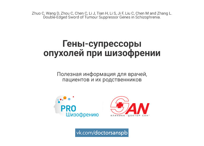 Шизофрения является распространенным психическим расстройством полигенной природы. Генетические мутации, варьирующиеся от однонуклеотидных полиморфизмов до крупных структурных изменений, были обнаружены в генах, связанных с риском развития как опухолей, так и шизофрении. Эпигенетические механизмы, включая метилирование/ацетилирование ДНК и микроРНК-регуляцию генов-супрессоров опухолей, также вовлечены в патогенез шизофрении. Zhuo et al. решили проверить последнюю гипотезу с целью установить причинно-следственную связь между функцией гена-супрессора опухоли и риском возникновения шизофрении. Накопленные данные показывают, что гены-супрессоры опухолей связаны с нарушениями в развитии нервной системы, которые приводят к поведенческим нарушениям и переходят в такие расстройства, как аутизм и шизофрения (см рис). Таким образом, функция гена-супрессора опухоли может опосредовать прямую связь между развитием и функционированием нервной системы и психическими расстройствами, включая шизофрению