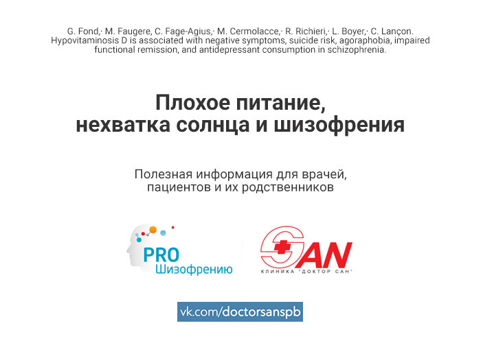 У пациентов с шизофренией, а также первым психотическим эпизодом, высока вероятность пониженного содержания витамина D. Гиповитаминоз D может приводить к уменьшению объёма гиппокампа, возможно, из-за нейротрофических, нейроиммуномодуляторных и глютаматергических факторов [2]. По предварительным данным, добавка витамина может улучшить когнитивную деятельность пациента с шизофренией; однако, результаты пока не точны. Недостаток витамина до сих пор связывают с метаболитическим синдромом при психотических расстройствах, резистентностью к инсулину, тироидной дисфункцией; высокий уровень его содержания в крови — со снижением периферийного неспецифического воспаления. Также обсуждается взаимосвязь между алкогольным расстройством влечения [3] и дефицитом витамина D. В недавнем исследовании G. Fond et al. обратили внимание на связь гиповитаминоза D с негативной симптоматикой, суицидальными наклонностями, потреблением антидепрессантов. В исследовании рассматривали потенциальных пациентов, которы