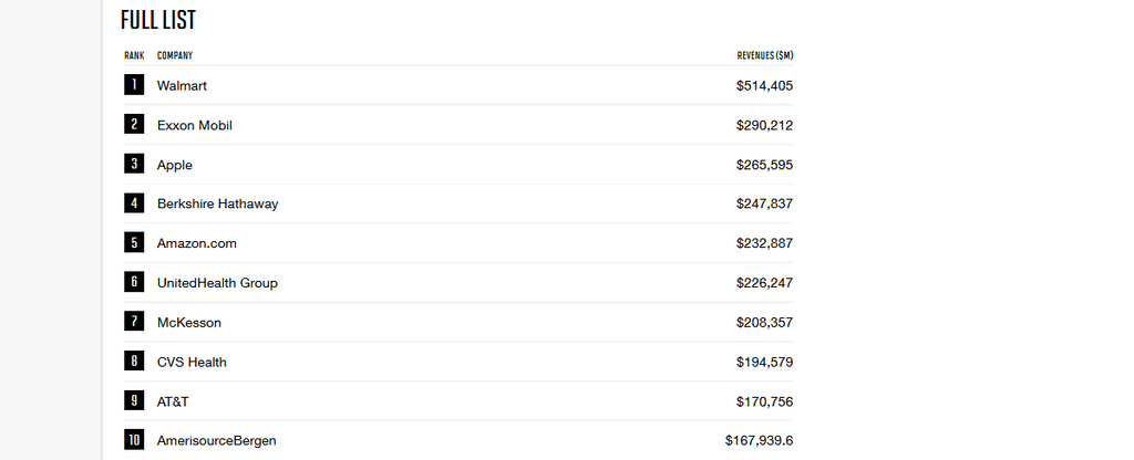 Выручка Apple, по данным Fortune, в 2018 году равнялась $265,6 млрд. Её опередили Walmart ($514,4 млрд) и Exxon Mobil ($290,2 млрд).