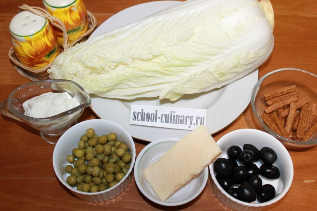 Сочетание пикантности и сочности в легком салате с маслинами и сухариками. Пекинская капуста очень нежная, она отлично звучит с твердым сыром. Консервированный горошек и маслины придают кушанью праздничность. Сухарики с любимым вкусом делают угощение соблазнительно- хрустящим. Ингредиенты: Приготовление: Капусту пекинскую освобождаем от верхних листьев, режем кочан на четыре части вдоль. Каждую шинкуем тонкими полосками или кусочками. При желании ее можно заменить на белокочанную, но получится не так нежно и воздушно, как с пекинкой. Капусту складываем в глубокую миску. Режем кубиками твердый сыр любимого сорта и отправляем его к капусте. С маслин и горошка сливаем маринад. Добавляем консервированный зеленый горошек к капусте и сыру. Важно выбирать качественный продукт. Горошек должен быть мягким и мелким. Если он жесткий, это говорит о низком качестве компонента. Маслины без косточек можно порезать на половинки или кусочки. А можно оставить их целыми. Вкусно, если маслины с начинкой