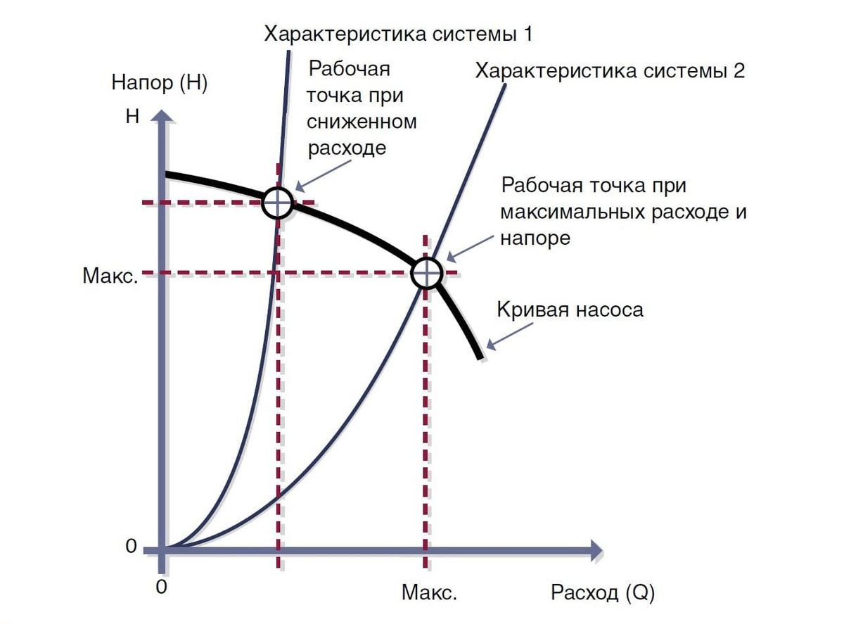 Перед выбором циркуляционного насоса следует рассчитать требуемые характеристики. Для этого необходимо знать два основных параметра системы отопления: Первый параметр определяется конфигурацией и размерами системы, также на него влияют характеристики трубопровода, по которому прокачивается теплоноситель (материал и внутренний диаметр труб). Второй параметр рассчитывается на основании требуемой мощности системы. Чтобы найти оптимальную производительность теплового насоса, необходимо наложить друг на друга два графика. Первый из них строится для каждой системы отопления индивидуально, с учетом потерь давления и расхода теплоносителя, а второй обычно присутствует в техническом паспорте насоса. Точка, в которой два графика пересекутся, будет рабочей точкой насоса. КАК ОПРЕДЕЛИТЬ КПД ЦИРКУЛЯЦИОННОГО НАСОСА Наилучший коэффициент полезного действия обычно находится примерно на половине его характеристик. К примеру, если в паспорте насоса указано, что он способен создать напор 7 метров, а мак