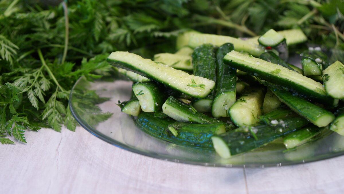 Соль, острый красный перец, зелень по вкусу. Подробное описание рецепта Обрезать огурцы спереди и сзади, затем порезать вдоль на четвертинки (как на фото). Мелко нарезать перец чили. Поместить все овощи в пакет, добавить зелень, черный молотый перец, соль. Завязать пакет и хорошо потрясти. Дать полежать 15 минут, затем потрясти и оставить ещё на 15 минут.