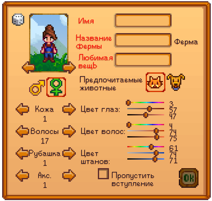 Игра Stardew Valley не ограничена временем, что позволяет игроку достичь своей цели нелинейно. Существуют различные способы получения дохода и множество видов деятельности на выбор, включая: фермерство, рыбную ловлю, собирательство, горное дело, борьбу с врагами, изготовление предметов, приготовление пищи, возможность дарить подарки, выполнять задания и восстановить городской клуб. Окно создания персонажа дает различные варианты настройки: внешний вид персонажа, его пол, имя, название фермы, любимая вещь и предпочтительное животное. На выбор есть 24 тона кожи, 32 причёски, 112 видов рубашек и 20 аксессуаров. Ползунки рядом с цветом глаз, волос и брюк представляют собой их оттенок, насыщенность и яркость. Предпочтительное животное определяет, какое домашнее животное вам предложат завести. Пол не влияет на брак в игре, вступить в брак можно с жителем любого пола. Любимая вещь будет упоминаться в игре, когда игрок съедает звездную каплю. Если выбрать ConcernedApe своей любимой вещью, то