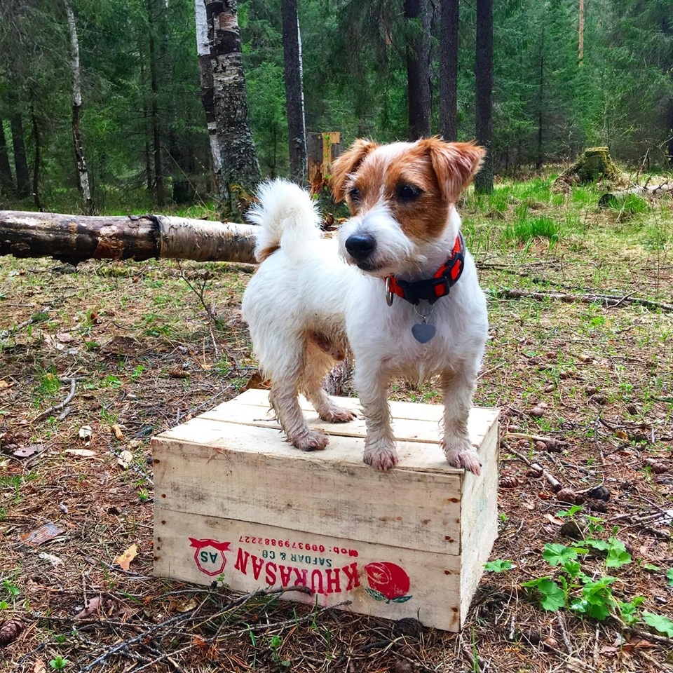 Я на прогулке со своим собакеном. Его зовут Читтер и он джек рассел. Он охотник, и пожирательство у него в крови. Голубя он нашел и хочет съесть. Пока удача на моей стороне и мне удалось собаку отогнать и даже пристегнуть к мужу поводком.