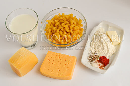 Одно из самых вкусных и любимых блюд, в основном в Америке, это макароны с сыром. Их любят и взрослые и дети. Именно по этому их упоминание так часто встречается в американских фильмах и сериалах. Если и Вам хочется попробовать это прекрасное блюдо, то этот рецепт для Вас. На три порции Вам понадобится: Макароны нужно отварить до состояния эль-данте ( слегка твёрдые внутри, в зависимости от сорта муки, время варки 3-5 минут). Оба вида сыра натереть на мелкой тёрке и отложить немного в отдельную посуду. Он будет нужен для добавления в соус и для посыпки макарон. Для заливки готовим соус бешамель, для этого: Заранее подогрейте молоко, не доводя до кипения. В небольшом сотейнике растопите сливочное масло. Постоянно помешивая, всыпьте в него муку. Она станет комковатой, так как заварится. Подогретое молоко вливаем в получившуюся массу, взбивая венчиком, разбивая комочки. Когда соус загустеет добавляем в него специи (соль, перец, паприку и мускатный орех). Добавить в соус большую