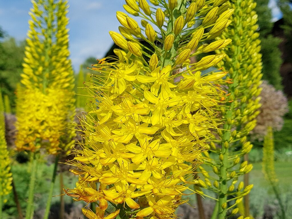 Этот титул эремурус заслуживает по праву. Не каждое садовое растение может сравниться с ним своей красотой и мощью. В Нидерландах эремурус называют иглой Клеопатры, в Германии - свечей, Поляки зовут его пустынником, а в Средней Азии его имя - Ширяш. Эремурус пока еще редко встречается в цветниках. Но тот, кто хоть раз видел этот цветок, непременно захочет иметь такой на своем участке. Эремурус растение многолетнее. В нижней своей части он образует розетку линейных листьев, а из центра розетки вырастает цветонос высотой 1,5-2,5 м. В соцветии эремуруса насчитывают до 500 цветков желтого, оранжевого, розового или белого цвета. Сажают эремурус в основном осенью, в сентябре. Он имеет корневище по внешнему виду напоминающее огромного паука. В центре большое утолщение с почкой, а от него в горизонтальном положении отходят мясистые корни. Обращаться с ними надо очень аккуратно, чтобы не поломать. Прежде всего надо помнить, что эремурус не выносит переувлажнения. Поэтому его не желательно сажат