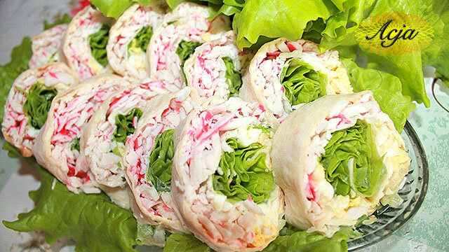 Такой рулет я делаю часто и без повода, т.к. он прекрасно подходит для легкого перекуса. Нам нужно: Лаваш армянский – 1 шт. Яйцо – 3шт, Крабовые палочки – 1 уп. (200 гр.) Листья салата – пол. пучка 3 средних огурца Майонез – 4-5 стол.л. Для начала подготовим продукты. Размороженные заранее крабовые палочки натрем на крупной терке. Огурцы натираем на крупной терке и немножко отжимаем, чтобы убрать излишний сок. Яйца, сваренные вкрутую, натрем на крупной терке. Лист лаваша разворачиваем на столе и смазываем майонезом. Если лаваш овальной формы, то обрезаем его по краям, чтобы получился прямоугольник, тогда рулетики получаться красивыми на срезе. Плотно и аккуратно сворачиваем лаваш в рулет, завернем в пищевую пленку и на пару часов отправим в холодильник. Перед подачей нарезаем лаваш на небольшие порционные кусочки. Если Вам понравился рецепт, ставьте лайки, пишите комментарии. А я на этом с Вами прощаюсь, готовте всегда с удовольствием!