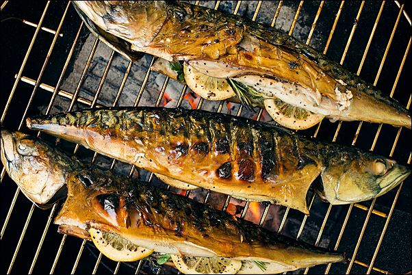 Сейчас я поделюсь этой супер находкой! По дороге на дачу в любом супермаркете покупаем свежемороженую скумбрию, 3 довольно жирненькие рыбки выходят примерно на 120 рублей. Пока добираемся до дачи, а это примерно 15-20 минут, она успевает немного подтаять, как раз до нужного состояния, когда можно аккуратно вспороть ей живот и вынуть кишки. Головы можно не убирать, с ними блюдо получается даже красивее. Тщательно промываю под проточной водой, убираю лишнюю влагу бумажным полотенцем, солю, перчу и снаружи и изнутри (приправы вообще можно добавить какие вам по вкусу). Затем нарезаю репчатый лук полукольцами и вкладываю его вну