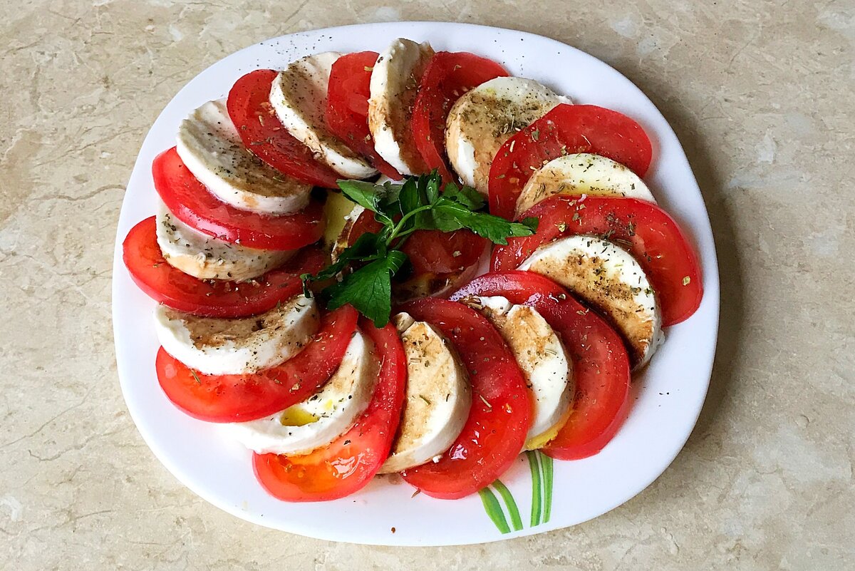Как вы думаете о каком салате пойдёт речь? Ну конечно же, о салате - капрезе. Это очень вкусный, простой и лёгкий салат. Для него мне понадобится: Приготовление: Сыр и помидоры нарежу кружочками. Выложу на тарелку попеременно сыр и помидоры. Сверху полью оливковым маслом и бальзамическим уксусом, затем посолю, поперчу и посыплю сушеным базиликом. Вуаля, салат готов! Как видите, все очень просто и быстро! А вы любите салат капрезе? Были ли вы в Италии? Если вам понравился рецепт, ставьте палец вверх, чтобы не потерять и готовьте с удовольствием! А также делитесь своим мнением в комментариях и спрашивайте, если у вас есть вопросы, с радостью вам отвечу! Приятного аппетита!:) На канале публикую интересные и вкусные рецепты! Подписывайтесь, чтобы ничего не пропустить! Смотрите также: Самый простой, быстрый и вкусный салат. Самое популярное блюдо Греции. Салат из паназиатского ресторана. Наипростейший салат для любителей авокадо. Самый популярный салат!