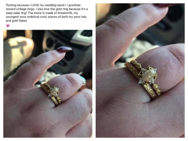 Женщина в соцсети рассказала о своем уникальном кольце, которое сделано из ее грудного молока и пуповины ее сына. Но не всем понравилась креативное украшение. Пользователи испытали легкое отвращение, увидев пост об этом обручальном кольце. Невеста разместила в Facebook снимок своего обручального кольца. Она рассказала, что для его изготовления она использовала свое грудное молоко, пуповину и волосы сына, а также золото — рассказал Daily Mail. Я люблю свою свадьбу! Я тяготею к винтажным кольцам. А также я люблю это золотое кольцо, потому что это - память.