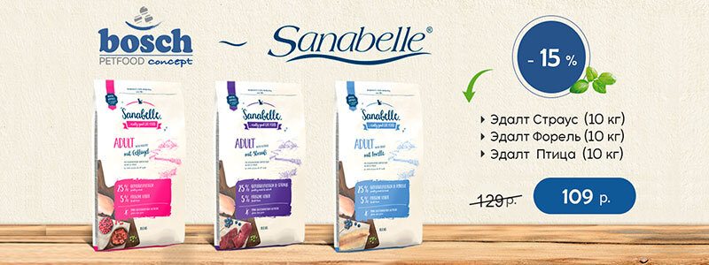Акции для кошек: 10кг корма Bosch Sanabelle по цене 109руб. вместо 129руб. В акции участвуют: Бош Санабелль Эдалт с форелью (10кг)
