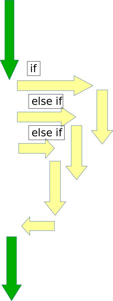 Рассмотрим создание множества веток выполнения с помощью операторов if, else if, else. Если у нас множество условий, по которым нам нужны отдельные блоки кода, то можно дополнить оператор if операторами else if, else. Например попытаемся по температуре понять какое время года за окном: Что происходит в этом отрывке кода: 1. Проверяем, температура больше 20 градусов? 2. Если условие выполняется, выводим - Похоже сейчас лето. 3. Если условие не выполняется (температура меньше или равно 20), то проверяем следующее условие. Проверяем, температура меньше -20 градусов? 4. Если условие выполняется, выводим - Наверняка зима! 5. Если условие не выполняется (температура больше или равно -20), то проверяем следующее условие. Проверяем, что температура меньше 10, но больше 0 градусов 6. Если ни одно из условий не подошло, то выполняем код по-умолчанию - выводим Не знаю. Задание Получить ответ пользователя: Проверить строку на равенство: Полезные ссылки: