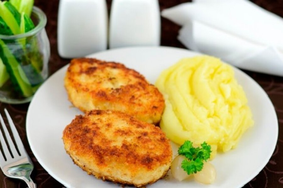 Нам потребуется: Картофель - 1 кг. Молоко - 200 - 300г. Масло сливочное - 50 г. Соль - по вкусу. Фарш - 1 кг. Яйцо - 1 шт. Хлеб - 2 кусочка. Перец - по вкусу. Чеснок - 2 - 3 зубчиков. Лук - 2 - 3 шт. Способ приготовления: Приготовим картофельное пюре. Промываем тщательно картофель. Очищаем и разрезаем. Выкладываем картофель в кастрюлю, заливаем холодной водой и ставим вариться. Как вода закипит, солим и убавляем огонь. Варим до готовности. Как картофель приготовится, сливаем воду. Ложим в горячий картофель масло и закрываем крышкой, чтобы масло растопилось. В это время доводим до кипения молоко. Немного молока оставим на котлеты. Толчем картофель, добавляем горячее кипяченое молоко и еще раз толчем тщательно, чтобы не осталось кусков картофеля. Теперь займемся котлетками. В фарш добавим яйцо, перемешаем тщательно. Хлеб смягчим молоком. Очистим и нарежем лук мелко. Так же очищаем и очень мелко рубим чеснок. Хлеб и лук добавим в фарш, так же добавим соль, перец и тщательно все перемес