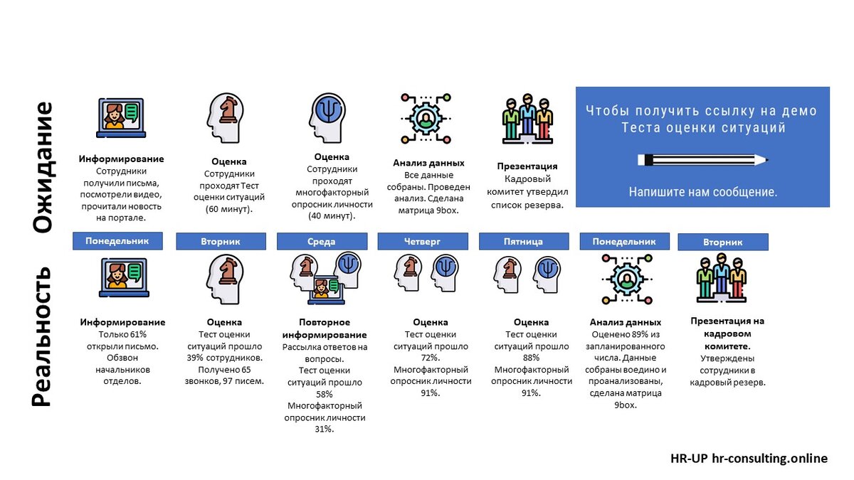 Хотим рассказать об одном амбициозном проекте, задача которого – сформировать кадровый резерв за одну неделю. Это крупный производственный комплекс с почти 5 тысячами сотрудников. Работа идет очень интенсивно, владелец считает, отвлекать людей более чем на 2-3 часа роскошь. Тренинги только добровольно и в нерабочее время. Задача, охватить всех сотрудников за исключением вспомогательного персонала (уборщицы, разнорабочие и так далее), до начальников отделов, получилось 4291 человек. Нам выделили неделю, чтобы мы могли провести оценку. Фактически половина сотрудников отдела персонала заказчика нам помогала весь период. Автоматизация заняла примерно неделю. Брали готовый опросник, прогнали на контрольной группе, убрали лишние вопросы. Параллельно разрабатывалась коммуникация – записали обращение генерального директора, подготовили письма, новости на портал, постеры. И генеральный и сотрудники отдела персонала клялись, что все очень ответственные и все пройдут в первый день.
